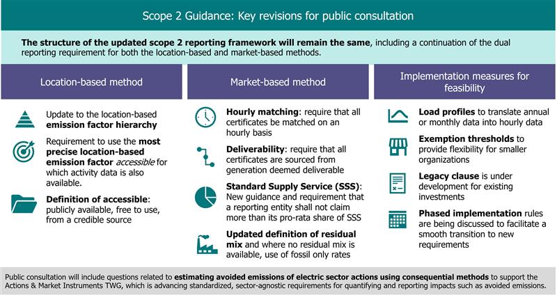 The revised draft also proposes feasibility measures, including for voluntary clean-energy claims under the market-based method. These measures include options to use load profiled to approximate hourly data and exemptions to hourly matching requirements for smaller reporters. A multiyear phased implementation timeline is also proposed. These measures would support the ability of reporting organizations to continue to calculate emissions, often with the same information they use today, in compliance with the updated requirements for scope 2, as well as enable actions and investments to reduce emissions.